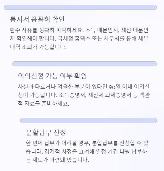 납부 지연 시 가산세와 체납 처분 등 불이익이 발생할 수 있습니다. 반드시 내용을 확인하고 정해진 절차에 따라 대응하세요.