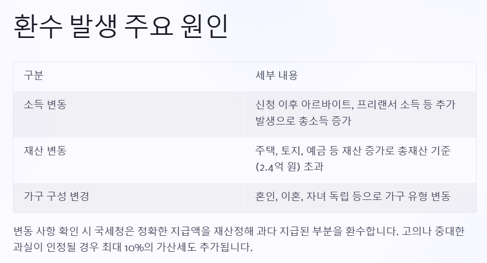 먼저 환수 사유를 정확히 파악하세요. 소득 때문인지, 재산 때문인지 확인해야 합니다. 국세청 홈택스 또는 세무서를 통해 세부 내역 조회가 가능합니다.
