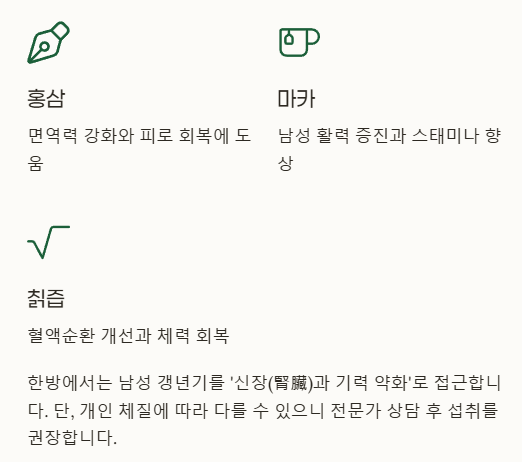 대표적으로 홍삼, 마카, 칡즙 등이 체력 회복과 남성호르몬 보충에 도움을 준다고 알려져 있습니다.