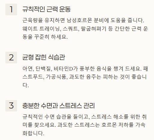 근육량을 유지하면 남성호르몬 분비에 도움을 줍니다.