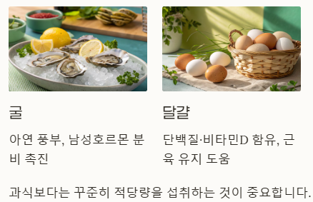 | 굴 | 아연 풍부, 남성호르몬 분비 촉진 |