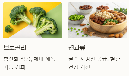 | 견과류 | 필수 지방산 공급, 혈관 건강 개선 |