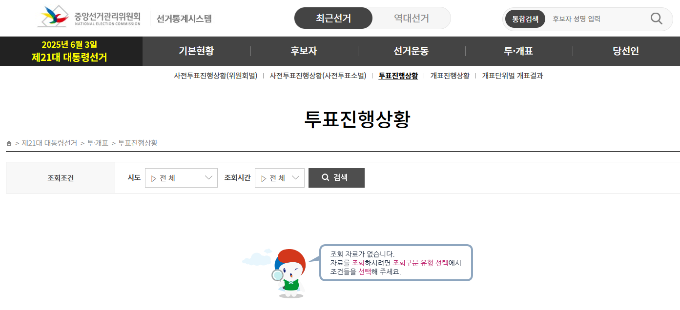 가장 신뢰할 수 있는 실시간 투표 상황은 중앙선거관리위원회가 제공하는 공식 데이터입니다.