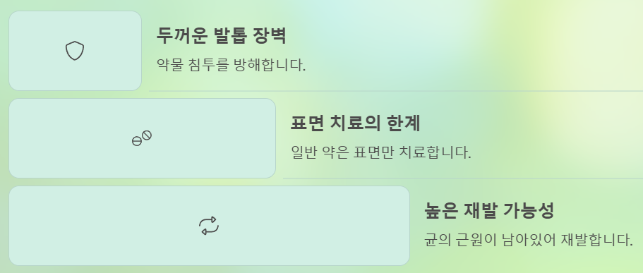 그 이유는 간단합니다. 두꺼워진 발톱이 약효 성분을 흡수하지 못하기 때문입니다. 이로 인해 표면만 치료되고 균의 근원은 그대로 남아 재발 가능성이 높아지게 되죠.