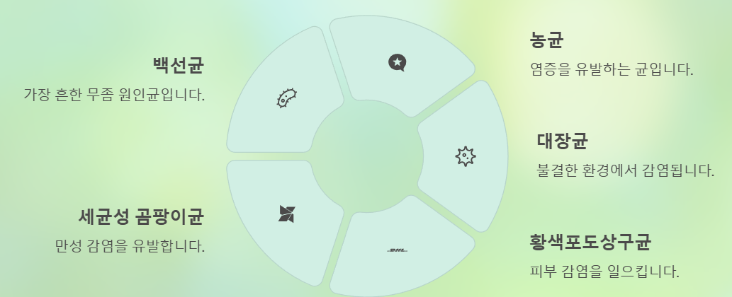"백선균, 농균, 대장균, 황색포도상구균, 세균성 곰팡이균" 등 다양한 유해균이 발톱 내부로 침투해 변형을 일으키기 때문입니다.