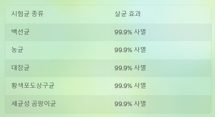 | 세균성 곰팡이균 | 99.9% 사멸 |