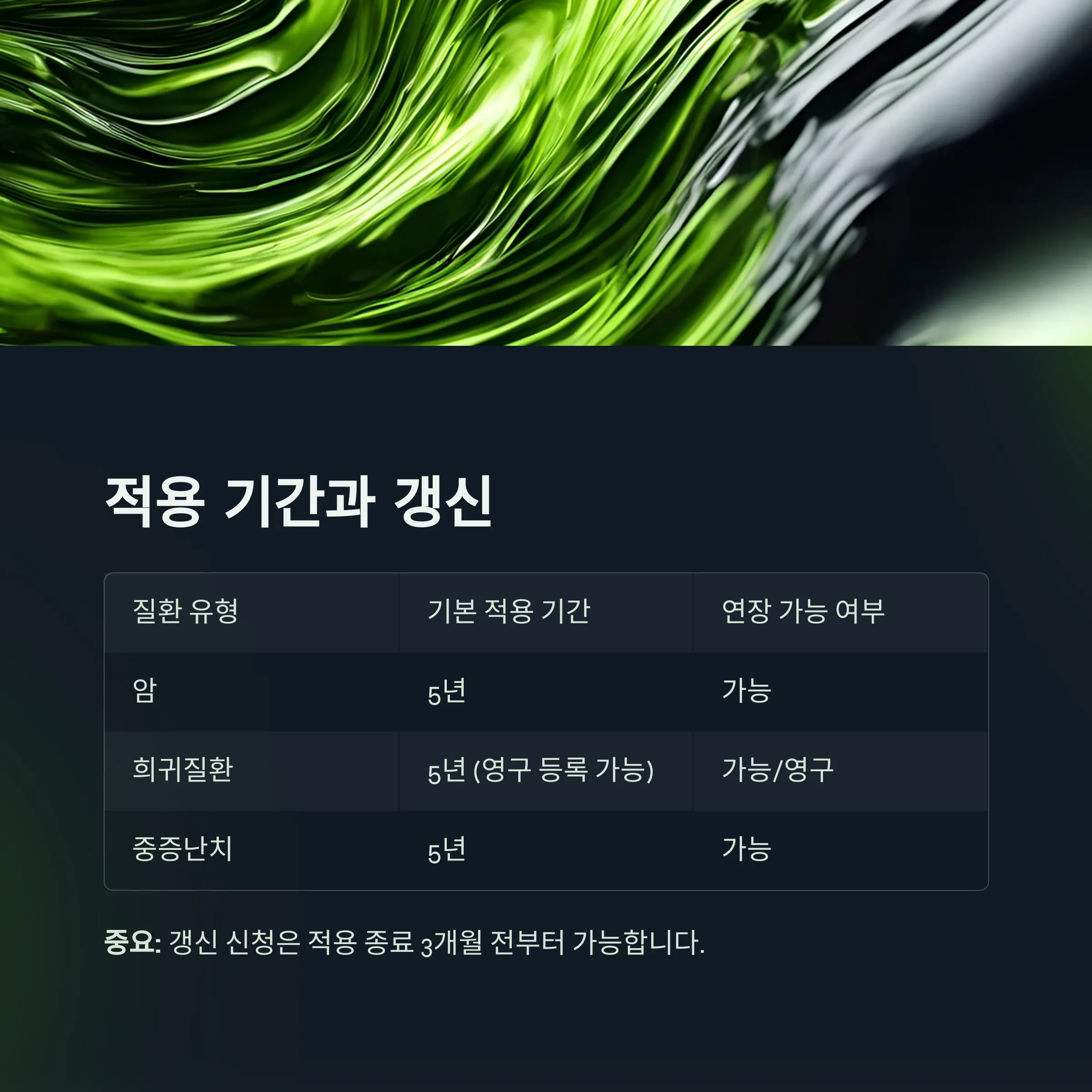 예를 들어, 암의 경우 기본 적용 기간은 5년이며, 이후 연장 신청을 통해 추가 적용 가능합니다.