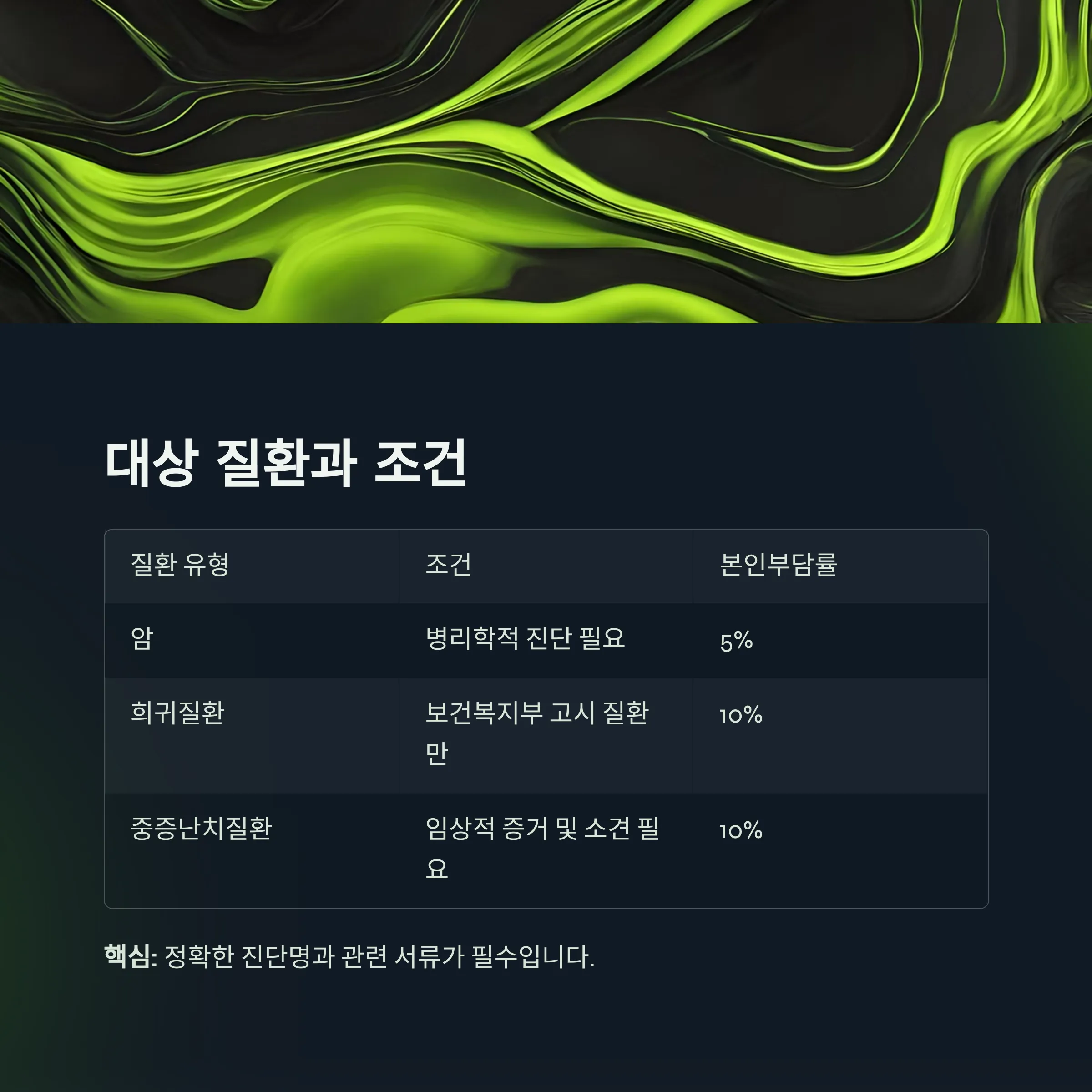 특히 희귀질환과 난치질환은 보건복지부 고시에 따른 질환만 해당하므로 반드시 목록을 확인해야 합니다.