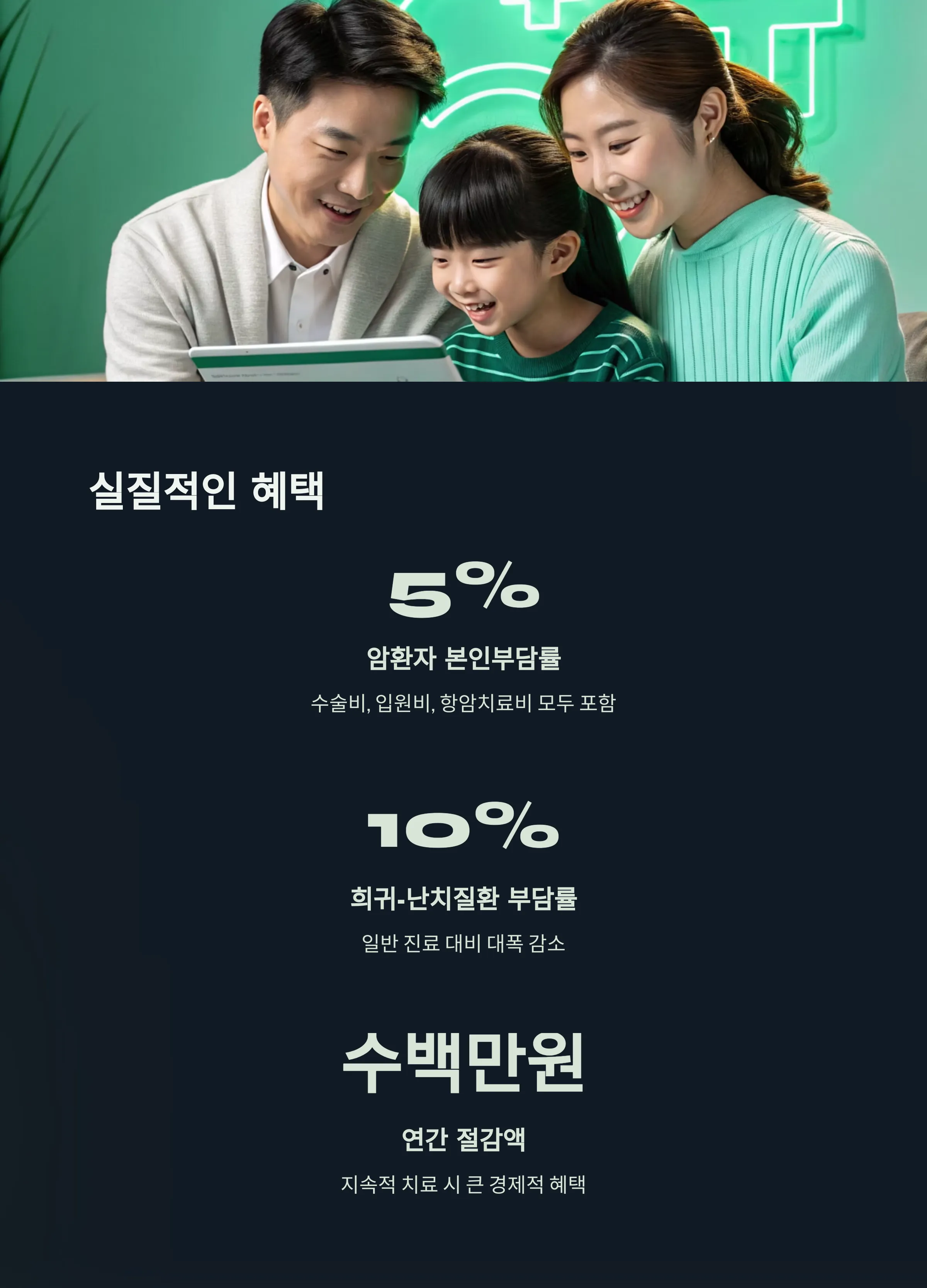 예를 들어 암환자의 경우, 수술비·입원비·항암치료비까지 대부분의 비용에서 본인부담이 5%로 줄어듭니다.