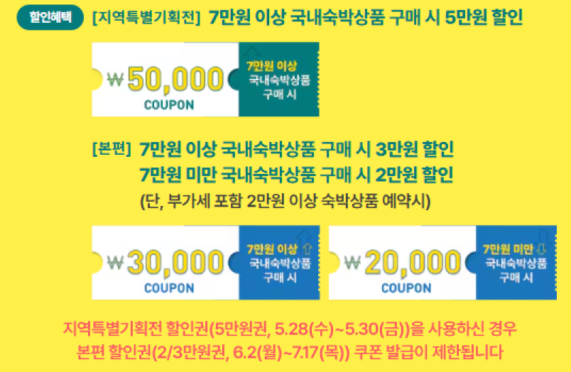 - 7만원 미만: 2만 원 할인 (2만 원 이상 숙박상품에 한함)