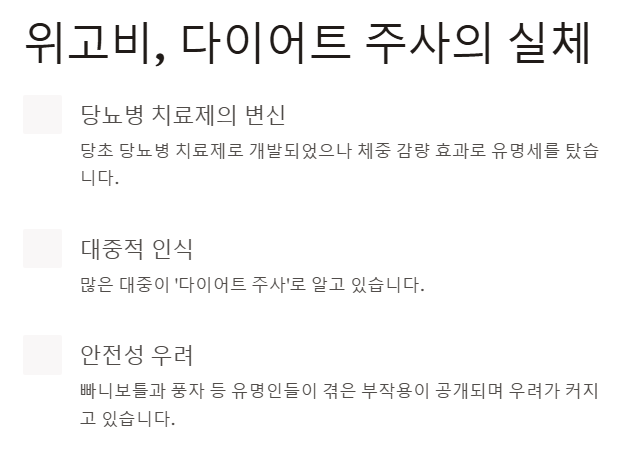 위고비는 당초 당뇨병 치료제로 개발되었으나, 체중 감량 효과로 유명세를 탔고 많은 대중이 '다이어트 주사'로 알고 있습니다.