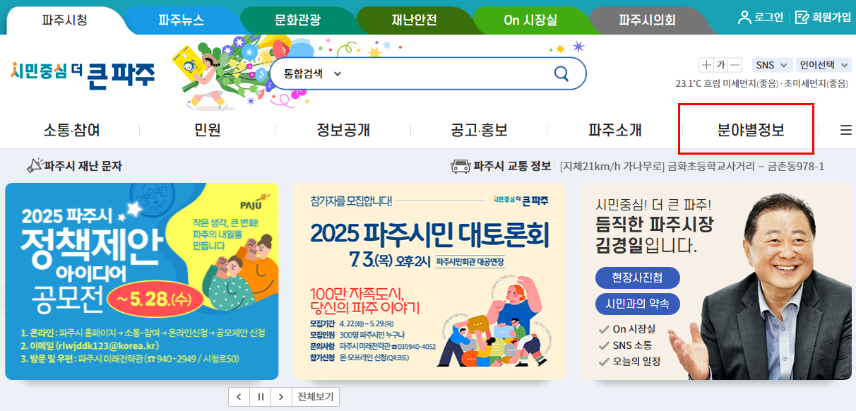 파주시청 홈페이지 → ‘분야별 정보’ → ‘일자리경제’ → ‘일자리센터’ 클릭 → 구인게시판에서 실시간 채용정보 확인 가능
