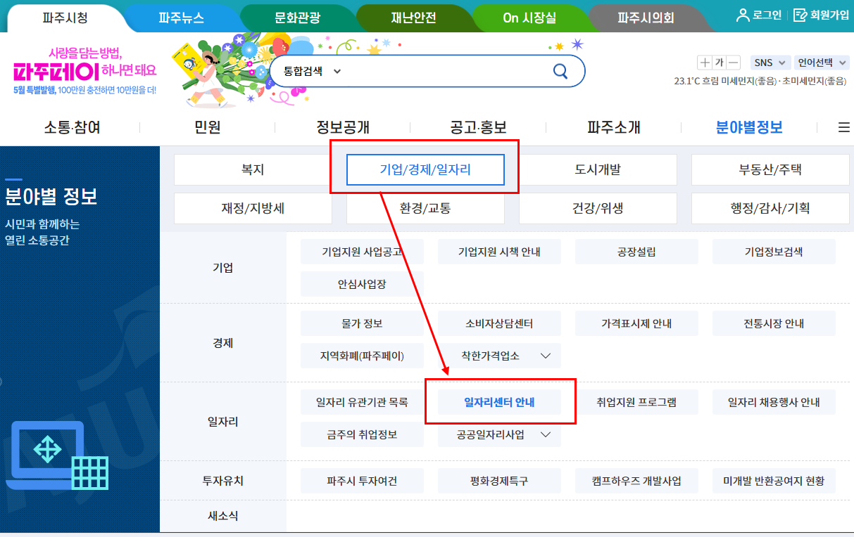 파주시일자리센터 홈페이지(https://gyeonggi.work.go.kr/paju/main.do)
