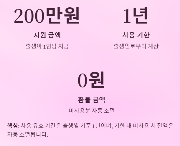 핵심: 사용 유효 기간은 출생일 기준 1년이며, 기한 내 미사용 시 잔액은 자동 소멸되니 반드시 사용 계획을 세워야 합니다.