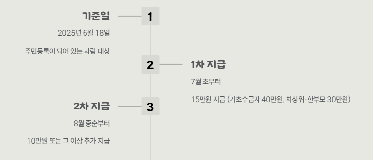 2025년 6월 18일 기준으로 주민등록이 되어 있는 사람은 1차로 7월 초부터 15만 원이 지급됩니다. 이후 2차 지급은