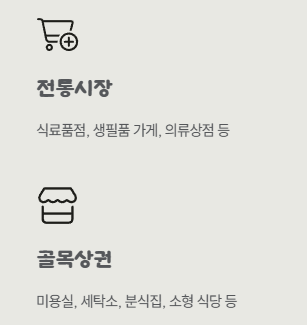 | 골목상권 | 미용실, 세탁소, 분식집, 소형 식당 등 |