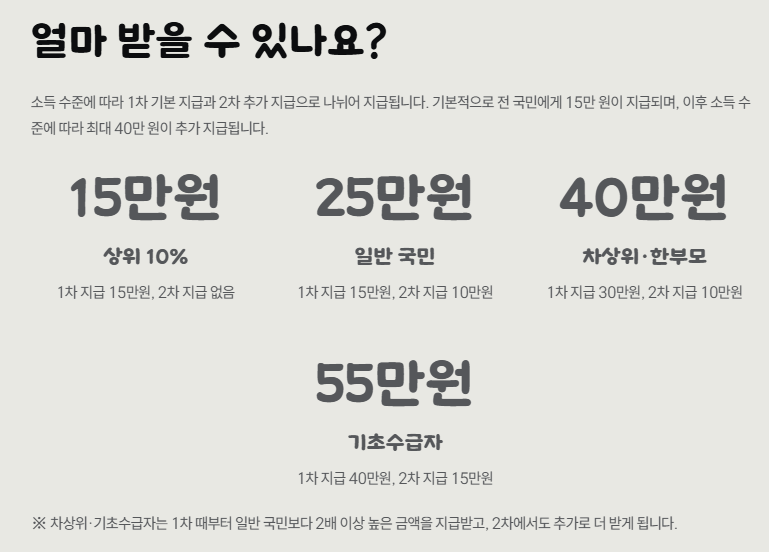 기본적으로 전 국민에게 15만 원이 지급되며, 이후 소득 수준에 따라 최대 40만 원이 추가 지급됩니다.
