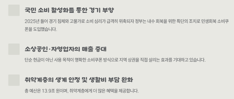 2025년 들어 경기 침체와 고물가로 소비 심리가 급격히 위축되자 정부는 내수 회복을 위한 특단의 조치로 민생회복 소비쿠폰을 도입했습니다.