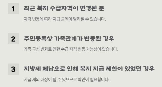 이 경우, 지급 제외 대상이 될 수 있으므로 '정부 24' 또는 '복지로' 사이트에서 자격 확인을 미리 해보는 것이 좋습니다.