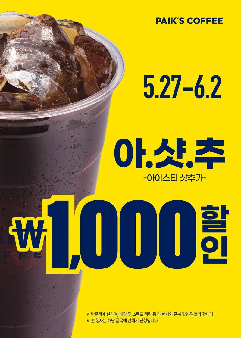 5월 27일부터 6월 2일까지 빽다방의 국민 음료 '아샷추(아이스티+에스프레소 샷)'를 단돈 1000원에 즐길 수 있습니다. 원래도 인기 많은 메뉴지만, 무더운 여름에 딱 어울리는 음료라 더 주목받고 있어요. 단, 빽사이즈 제외, 옵션 추가 불가는 필수 유의사항입니다.