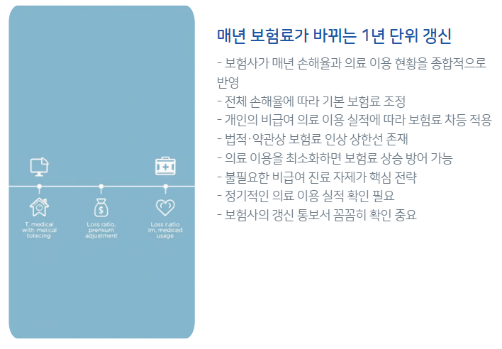 특히 매년 갱신되는 보험료뿐 아니라, 15년 단위의 약관 개정 가능성, 비급여 이용 실적에 따른 실질적인 보험료 인상 구조까지 꼼꼼히 알아야 합니다.