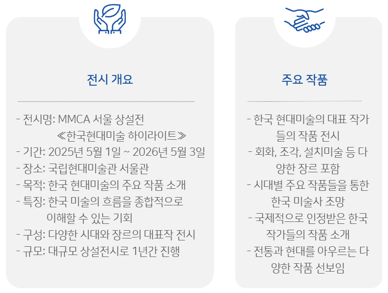 국립현대미술관 서울관에서는 2025년 5월 1일부터 2026년 5월 3일까지 'MMCA 서울 상설전 «한국현대미술 하이라이트»' 전시가 진행됩니다.