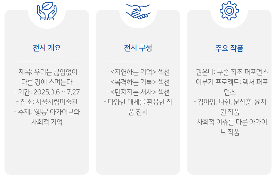 이 전시는 '행동' 아카이브 기반 작품과 아카이빙 실천을 연결하여 사회적 기억을 형성하는 '기억기관'으로서의 역할을 강조합니다.