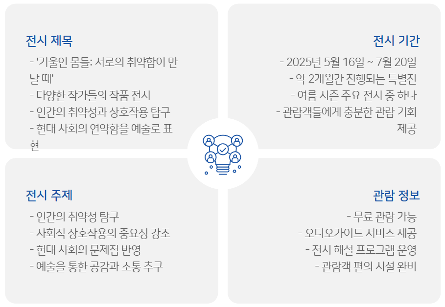 국립현대미술관 서울관에서는 2025년 5월 16일부터 7월 20일까지 '기울인 몸들: 서로의 취약함이 만날 때' 전시가 진행됩니다.