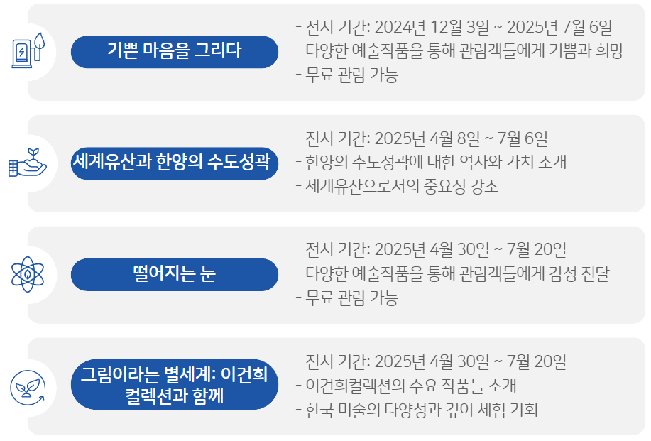 서울시립미술관에서는 2025년 4월 8일부터 7월 6일까지 '세계유산과 한양의 수도성곽' 전시가 진행됩니다.