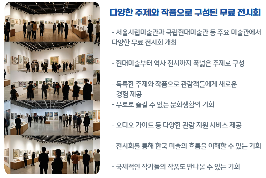 서울시립미술관과 국립현대미술관 등에서 진행되는 다양한 무료 전시회를 소개합니다. 각 전시는 독특한 주제와 작품들로 구성되어 있어 관람객들에게 새로운 경험을 선사합니다.