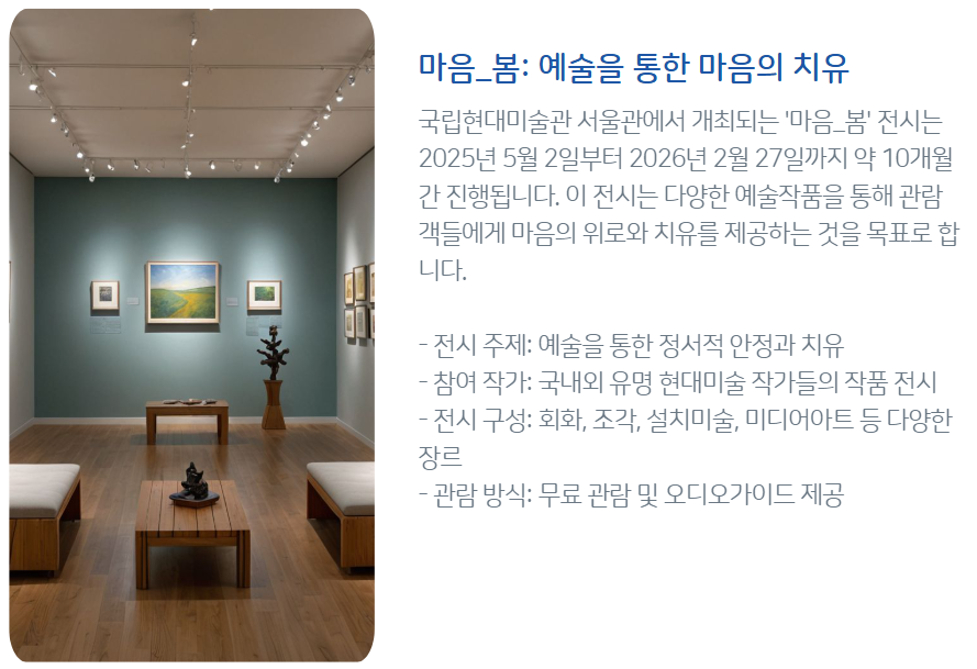 국립현대미술관 서울관에서는 2025년 5월 2일부터 2026년 2월 27일까지 '마음_봄' 전시가 진행됩니다.