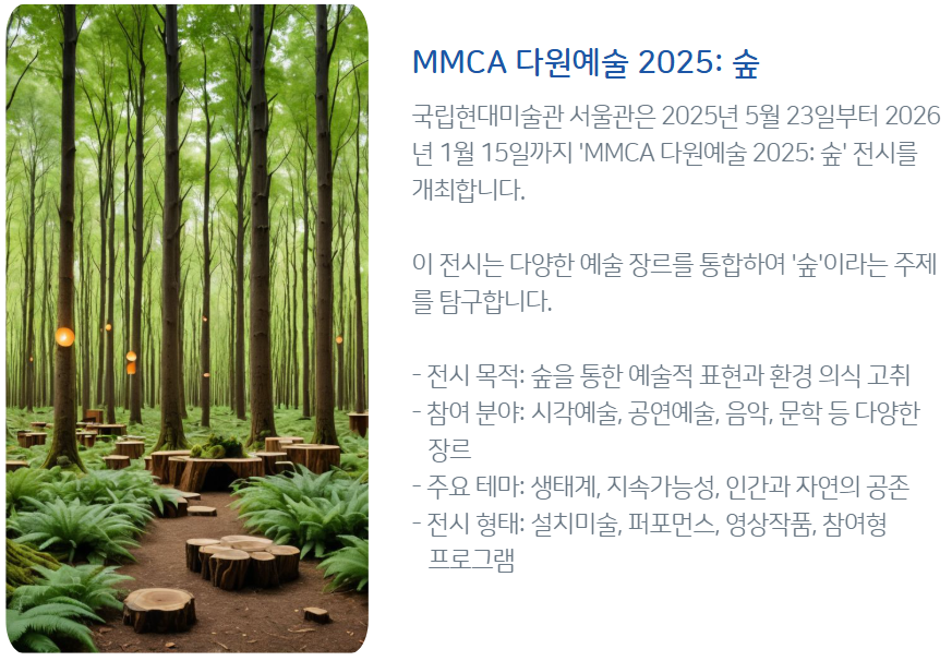 국립현대미술관 서울관에서는 2025년 5월 23일부터 2026년 1월 15일까지 'MMCA 다원예술 2025: 숲' 전시가 진행됩니다.